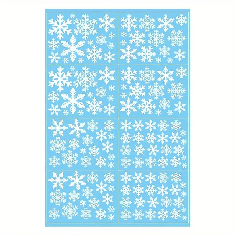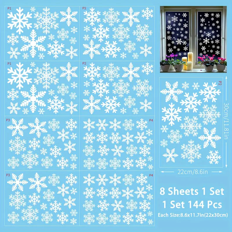 Conjunto de 144 autocolantes clássicos de flocos de neve brancos - Filme de Cloreto de Polivinilo Reutilizável com Montagem de Adesivo Estático, Decorações de Natal Semibrilhantes para Superfícies de Vidro em Casa e Escritório, Autocolantes de Natal Dupla Face para Frigorífico e Janelas, 8 Folhas
